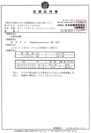 | 日本紡績檢查協(xié)會 銀康二氧化鈦的檢測報告檢測表明:抗甲氧西林金黃色葡萄球菌的殺菌率高達99.9% 銀康納米銀檢測報告 檢測表明:銀康納米銀能有效消除金黃色葡萄球菌 | |