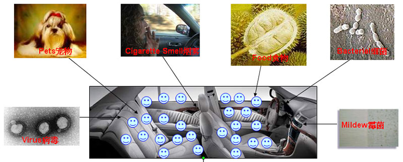 1、可消除汽車內(nèi)部各種皮革、塑料、金屬、黏合劑等散發(fā)出揮發(fā)性有機(jī)化合物(TVOC)。