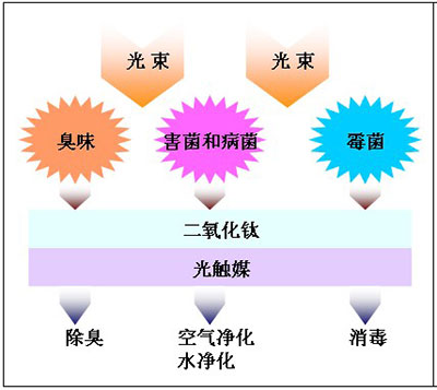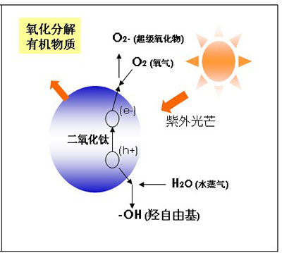 銀康光觸媒二氧化鈦工作原理: 光觸媒二氧化鈦在光照射條件下起作用,它能在室溫下分別與水蒸氣和氧氣發(fā)生反應(yīng)產(chǎn)生羥自由基和超級(jí)氧化物,而羥自由基和超級(jí)氧化物具有超強(qiáng)的氧化性,能氧化分解空氣中的有機(jī)物質(zhì),可使微生物體內(nèi)大分子的核酸、蛋白質(zhì)和DNA等發(fā)生過(guò)氧化反應(yīng),導(dǎo)致細(xì)胞直接損傷而死亡,最終將細(xì)菌氧化成CO2、H2O和微量無(wú)機(jī)鹽,達(dá)到消除微生物污染的目的。