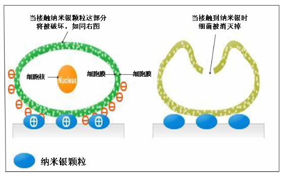 帶正電荷的納米銀顆粒接觸到帶負(fù)電荷的細(xì)菌細(xì)胞后,會(huì)相互吸附,它能有效擊穿細(xì)胞膜,在細(xì)胞內(nèi)發(fā)生反應(yīng),造成蛋白質(zhì)凝固,使細(xì)菌合成酶的活性遭到破壞,干擾細(xì)菌DNA的合成,使細(xì)菌喪失分裂增殖能力而死亡;與此同時(shí)銀離子和蛋白質(zhì)的結(jié)合還破壞了細(xì)菌的呼吸系統(tǒng),物質(zhì)傳輸系統(tǒng)。銀離子殺死細(xì)菌后,又會(huì)從細(xì)菌的尸體游離出來(lái),沒(méi)有任何消耗,仍保持原有的抗菌能力,因此納米銀的抗菌能力可長(zhǎng)期有效。通過(guò)納米技術(shù)處理后的銀表面急劇增大,能擴(kuò)大與病菌和真菌接觸的表面積,加強(qiáng)了抗菌和抗真菌的功效。如下圖所示:
