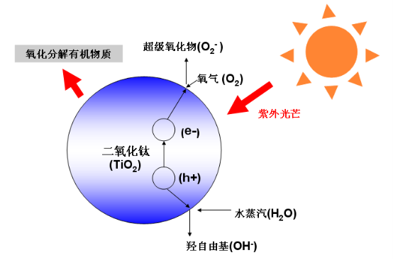 銀康的光觸媒二氧化鈦在紫外光照射條件下起作用,它能在室溫下分別與水蒸氣和氧氣發(fā)生反應(yīng)產(chǎn)生羥自由基和超級(jí)氧化物,而羥自由基和超級(jí)氧化物具有超強(qiáng)的氧化性,能氧化分解空氣中的有機(jī)物質(zhì),可使微生物體內(nèi)大分子的核酸、蛋白質(zhì)和DNA等發(fā)生過(guò)氧化反應(yīng),并導(dǎo)致細(xì)胞不可逆的直接損傷而死亡,最終將細(xì)菌氧化成CO2、H2O和微量無(wú)機(jī)鹽,實(shí)現(xiàn)了零環(huán)境污染的綠色消除微生物污染的目的。 如下圖所示: